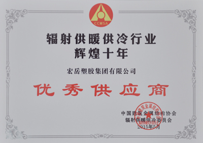 2015年5月15日,中国辐射供暖供冷委员会十周年庆典在北京盛大举行。会上表彰了一批对辐射供暖供冷行业发展作出突出贡献的企业和个人,好博(中国)体育集团喜获中国辐射供暖供冷行业辉煌十年优秀供应商殊荣,好博(中国)体育塑胶集团有限公司张思良总经理荣获中国辐射供暖供冷行业功勋奖。