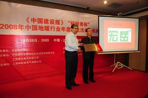4月28日下午,《中国建设报》主办的2008年中国地暖行业年度盘点活动颁奖典礼在上海光大中心酒店隆重举行,秦皇岛好博(中国)体育管业当选“2008年中国地暖行业PE-Xa管材领军品牌”,沉甸甸的牌匾由中国建筑金属结构协会地面供暖委员会华明九主任亲手授予好博(中国)体育公司总经理助理王明科。本次盘点活动中张思良副总经理获得2008年度地暖行业十大风云人物提名。