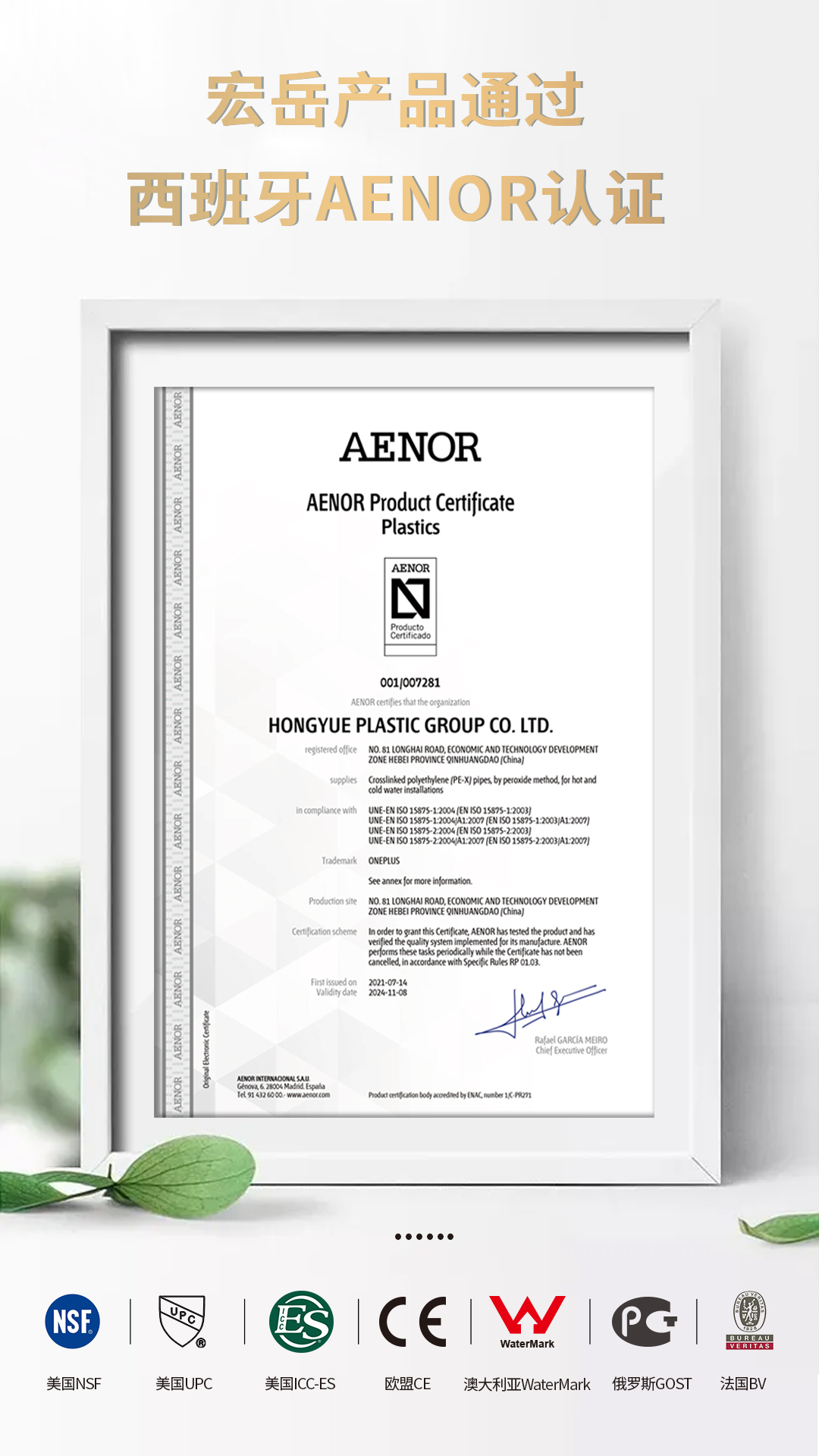 继通过美国NSF、ICC-ES、UPC,欧盟CE,澳大利亚WaterMark,俄罗斯GOST,法国BV等国际认证后,好博(中国)体育产品又通过西班牙AENOR认证。